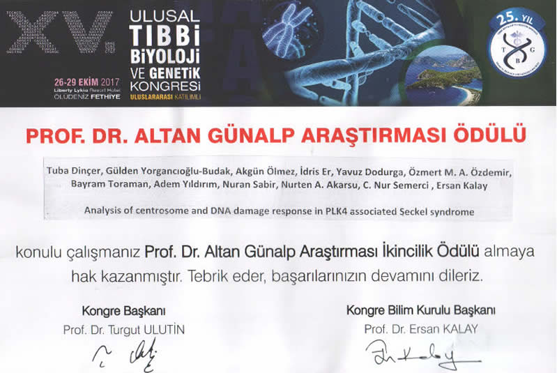 2. Prof. Dr. Altan Günalp Araştırması İkincilik Ödülü; Dinçer T, Yorgancıoğlu-Budak G, Ölmez A, Er İ, Dodurga Y, Özdemir ÖM, Toraman B, Yıldırım A, Sabir N, Akarsu NA, Semerci CN, Kalay E. Analysis of centrosome and DNA damage response in PLK4 associated Seckel syndrome.